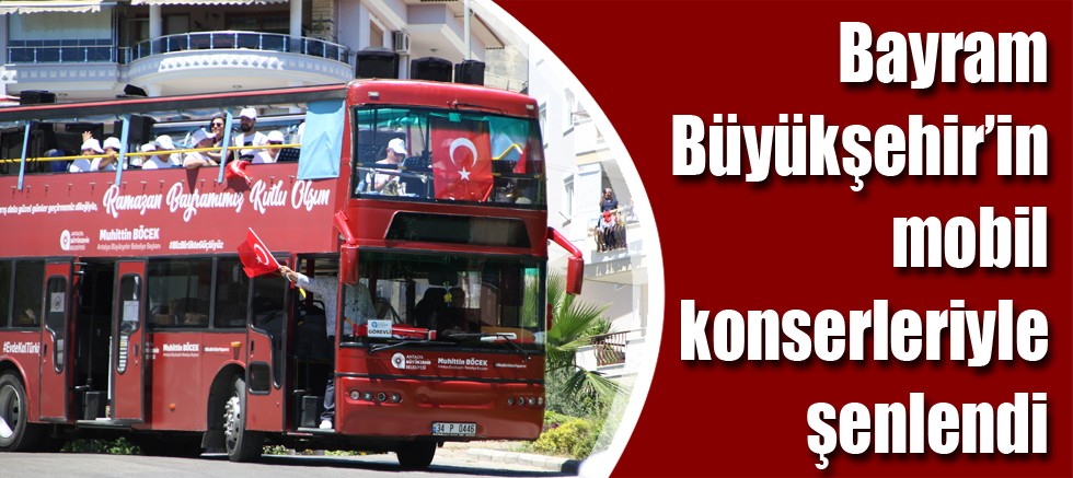 Antalya Büyükşehir Belediye Başkanı Muhittin Böcek’in talimatıyla Kültür ve Sosyal İşler Dairesi Başkanlığı tarafından bayram boyunca üç ayrı orkestra ile Antalya merkezi ve ilçelerde mobil konserler düzenlendi. Pandemi önlemleri çerçevesinde alınan sokağa çıkma kararıyla Ramazan Bayramı’nı evlerinde geçirmek zorunda kalan vatandaşlara bayram sevincini yaşatmak ve moral vermek amacıyla arife günü başlayan konserler büyük ilgi gördü.