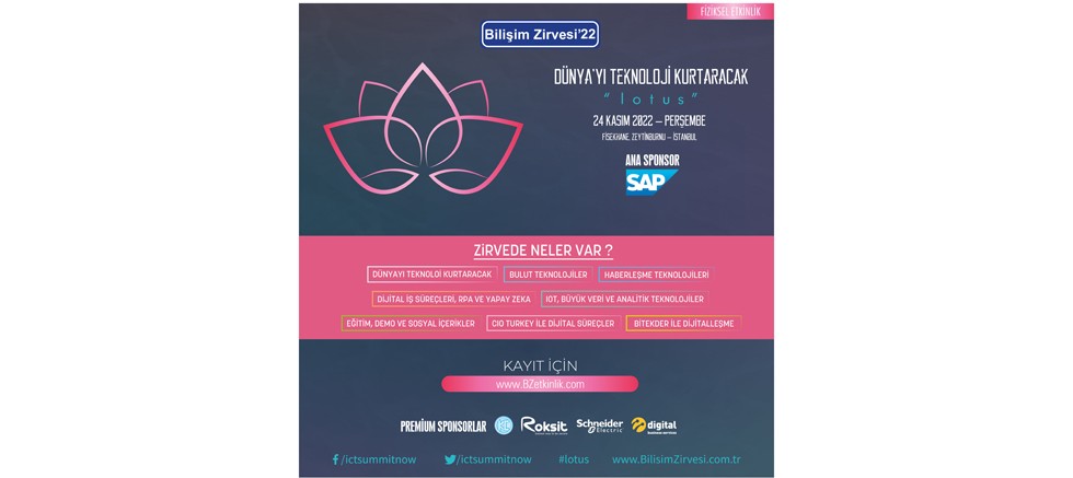 Çağdaş, üretken ve yenilikçi bir ekonomi sistemi odağında 22 yıldır bugüne ve geleceğe teknoloji perspektifinden bakan Bilişim Zirvesi, bu yıl ‘’Dünya’yı Teknoloji Kurtaracak ‘lotus’” teması ile 24 Kasım 2022 tarihinde Zeytinburnu Fişekhane’de gerçekleştirilecek. Pandeminin ardından bu yıl fiziksel olacak zirveye online kayıt yaptıranlar bedelsiz olarak katılabilecekler.