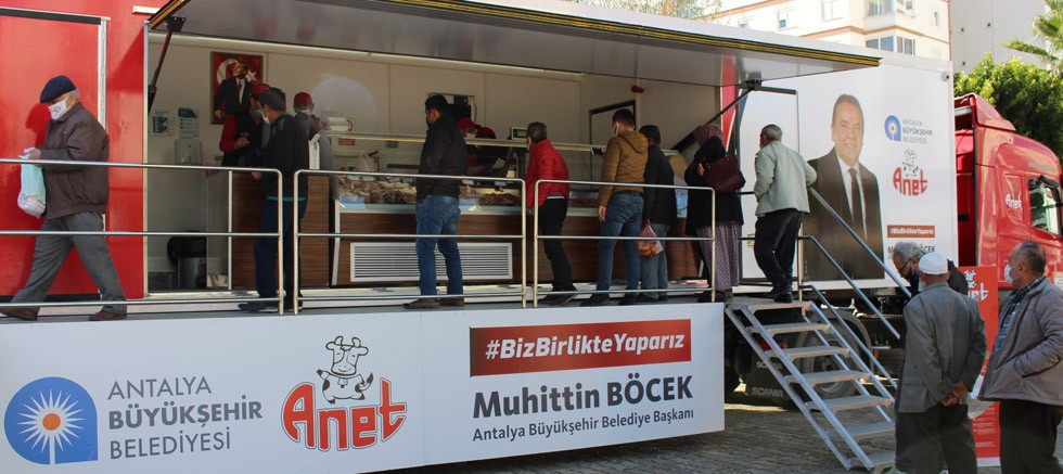 Antalya Büyükşehir Belediye Başkanı Muhittin Böcek’in seçim vaatleri arasında yer alan ANET Mobil Halk Et Satış Mağazası, hafta boyunca batı ilçelerinde vatandaşlarla buluştu. Sağlıklı, güvenilir ve uygun fiyatlı et ve et ürünlerini vatandaşlarla buluşturan Halk Et Mobil Satış Tırı 10.00-17.00 saatleri arasında ilçelerde et ve et ürünlerinin satışını gerçekleştirdi. Kemer, Elmalı, Korkuteli, Demre ve Kumlucalı vatandaşlarda hizmet veren Halk Et Tırı’ndan alış veriş yapan vatandaşlar Büyükşehir Belediye Başkanı Muhittin Böcek’e teşekkür etti.