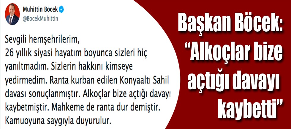 Antalya Büyükşehir Belediye Başkanı Muhittin Böcek, Konyaaltı sahili davasının sonuçlandığını ve Alkoçlar'ın kendilerine açtığı davayı kaybettiğini açıkladı.