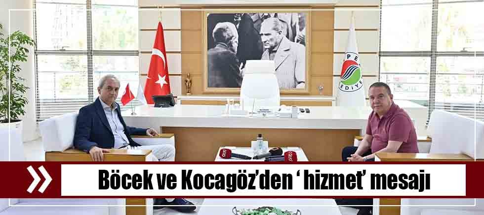 Başkanı Muhittin Böcek’in ziyaretinden duyduğu memnuniyeti dile getiren Kocagöz, açıklamasında şunları söyledi: “Muhittin Bey, Büyükşehir Belediye Başkanım olmasının yanı sıra aynı zamanda büyüğüm ve ağabeyimdir. Büyükşehir Beledi Meclis Üyesi olarak geçtiğimiz dönem kendisiyle yol arkadaşlığı yaptım. Muhittin Başkanım, şahsıma hep güvendi. 5 yıl boyunca Büyükşehir Belediye Başkan Vekilliğini, Büyükşehir Meclisi Başkanlığını, encümen ve denetim komisyonu üyeliğini şahsıma verdi. Bana güvenen Başkanımı mahcup etmedim, başını öne eğdirmedim. 31 Mart Mahalli İdareler Seçimleri’nde Kepez’de bize güçlü bir destek verdi. Seçimleri kazandık. Kepez’de kazanmamız, Muhittin Başkanımızın Büyükşehir’i kazanmasına da ciddi bir katkı sağladı. Şimdi Başkanımla el ele vererek, birlik ve beraberlik içerisinde Kepez’imizi, Antalya’nın vitrini yapacağız.”