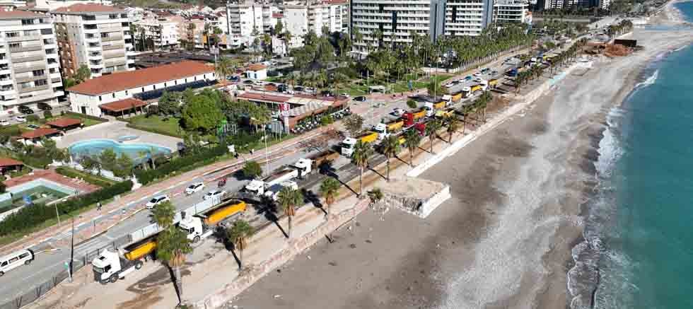 Konyaaltı Sahili Çevre Düzenleme Projesinde kapsamında Antalya Büyükşehir Belediyesi tarafından yürütülen çalışmalar son hızıyla sürüyor. Boğaçayı ile Liman arasını kapsayan alanda onlarca kamyon ve iş makinesi çalışıyor.