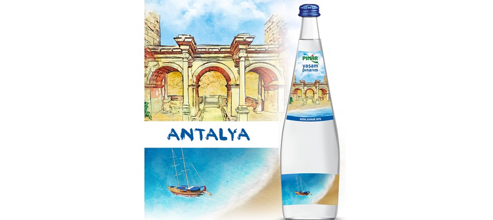 Türkiye’nin en meşhur şehir simgelerinin cam şişelere resmedildiği proje, İstanbul, Ankara ve İzmir’den sonra rotasını bu kez de Antalya’ya çevirdi. Gezilecek yerleri ve doğal güzellikleriyle Türkiye’nin turizm başkenti olan Antalya’nın en meşhur simgeleri, Pınar Su cam şişelerine resmedildi. Antalya etiketli su şişelerinde Üç Kapılar olarak da anılan, Antalya'nın en iyi korunmuş eserlerinden biri olan Hadrianus Kapısı dikkat çekiyor. Üzerindeki Latince kitabe ile turistlerin ilgisini toplayan, Pamfilya bölgesinin en güzel kapısı olarak bilinen Hadrian Kapısı o dönem bölgede yer alan tüm medeniyetlerden izler taşımasıyla meşhur. Tarihi anıtın yanı sıra Antalya’nın eşsiz deniz ve kumsal görsellerinin yer aldığı su şişeleri, tüketicilerini bu yaz kültürel bir mavi yolculuk turuna çıkarıyor.