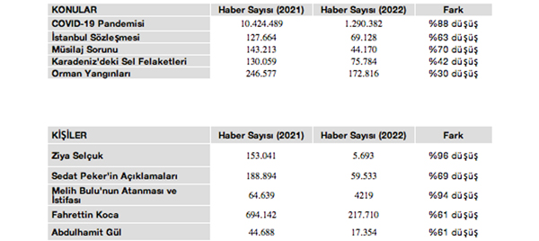 Online Basın Bülteni ve PR Servisi B2Press tarafından aynı kapsamda 2021’de hazırlanan raporun en çok konuşulan konular listesinde ilk üçte 10.424.489 haberle COVID-19, 643.293 haberle Türk Lirası’nın Değer Kaybı ve 316.256 haberle Merkez Bankası’ndaki başkan değişikleri yer almıştı. Sıralamayı Taliban’ın Afganistan’ı ele geçirmesi, orman yangınları ve Sedat Peker’in açıklamaları takip etmişti.