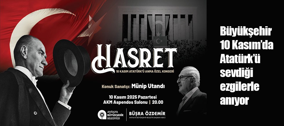 Antalya Büyükşehir Belediyesi’nin düzenlediği bu anlamlı konserde, bir milletin ortak hafızasında yer eden ezgilerle Atatürk’e olan sevgi, saygı ve minnet duygusu bir kez daha sahnede hayat bulacak. Antalyalılar bu özel konseri ücretsiz olarak izleyebilecek.