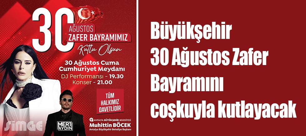 Antalya Büyükşehir Belediyesi, 30 Ağustos Zafer Bayramı'nı coşkuyla kutlamaya hazırlanıyor. Zafer Bayramının 102. Yıldönümü 30 Ağustos Cuma saat 21.00’da Cumhuriyet Meydanı’nda ünlü sanatçı Simge Sağın konser verecek.