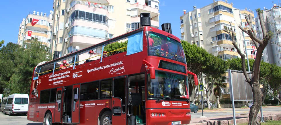Gazi Mustafa Kemal Atatürk’ün dünya çocuklarına armağan ettiği 23 Nisan Ulusal Egemenlik ve Çocuk Bayramı ve TBMM’nin açılışının 100. Yıl dönümü haftası nedeniyle Antalya Büyükşehir Belediye bandosu hafta sonu Antalyalılara sürpriz konser verdi. İki günlük sokağa çıkma yasağı kapsamında bom boş sokaklarda gezici otobüs üzerinden müzik yapan bandoya Antalyalılar evlerinden eşlik etti.