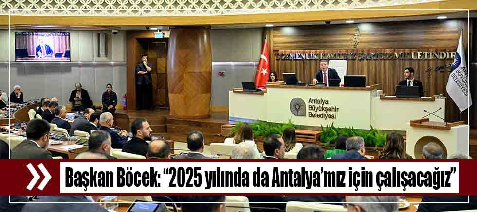 2025 yılında da Antalya için azimle çalışmaya devam edeceklerini söyleyen Başkan Böcek, “Herkesin başkanı olmaktan bir an olsun vazgeçmeden yürüyeceğim. Birlikte yürümeye devam edeceğiz. Yıllık yapmamız gerekenlerle ilgili A’dan Z’ye her şeyi paylaştım. Her şeyi paylaşmaktan hiç vazgeçmeyeceğim. Hep beraber 19 ilçe belediye başkanı arkadaşımla çalışacağız. Bu hafta İbradı, Gündoğmuş ve Akseki Belediye Başkanlarımı ziyarete gidiyorum. Orada da bizim insanlarımız yaşıyor. Hiçbir kimseyi ötekileştirmeden, oradaki muhtarlarımızla vatandaşlarımızla görüşmelerimize devam edeceğiz. Antalya hepimizin. Antalya Türk turizminin başkenti, tarımın başkenti. Verimli topraklar bizim. Onun için burada siyaset üstü çalışacağız. Önerilerinizi de iktidar muhalefeti demeden bu meclise alacağımdan hiç şüpheniz olmasın. Ben tekrar bu vesileyle yeni dönemimizin, 2025 yılının hayırlı olmasını diliyorum” ifadelerini kullandı.