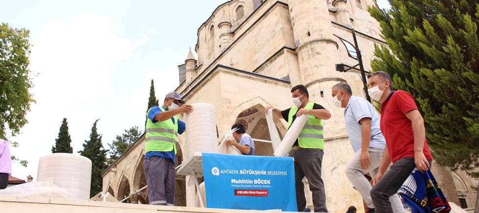 Antalya Büyükşehir Belediyesi, pandemi nedeniyle sosyal mesafe kuralları çerçevesinde cami avluları, okul bahçeleri ve kapalı pazar alanlarında kılınan Cuma Namazı öncesinde 19 ilçede vatandaşlara 100 bin tek kullanımlık seccade dağıttı.