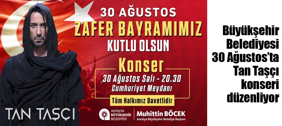 Antalya Büyükşehir Belediyesi, 30 Ağustos Zafer Bayramı’nı Cumhuriyet Meydanı’nda Tan Taşcı konseri ile kutlayacak. Büyükşehir Belediyesi’ne ait resmi plakalı toplu ulaşım araçları da 30 Ağustos’ta ücretsiz yolcu taşıyacak.