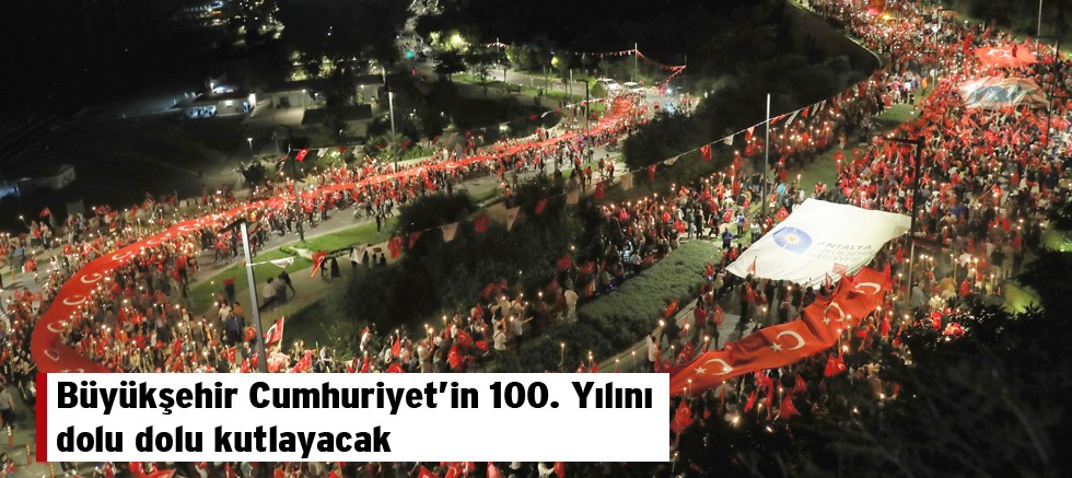Antalya Büyükşehir Belediyesi Türkiye Cumhuriyeti’nin kuruluşunun 100. Yılını büyük bir coşkuyla kutlamaya hazırlanıyor. 16- 30 Ekim tarihleri arasında merkez ve ilçelerde Cumhuriyetin 100. Yılı birbirinden renkli ve anlamlı etkinliklerle kutlanacak. Antalya Büyükşehir Belediyesi Kültür ve Sosyal İşler Dairesi Başkanlığı koordinesinde düzenlenecek etkinlikler Antalyalılara Cumhuriyet coşkusunu ve heyecanını yaşatacak.