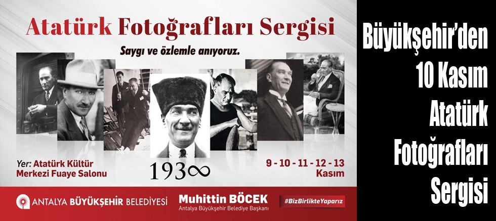 Antalya Büyükşehir Belediyesi Kültür ve Sosyal İşler Dairesi Başkanlığı, 10 Kasım Atatürk’ü Anma Günü’nde Atatürk fotoğraflarından oluşan bir sergi düzenliyor. İzi silinemeyecek birçok başarıya imza atarak en büyük eserim dediği modern Türkiye Cumhuriyeti’ni kuran Gazi Mustafa Kemal Atatürk’ü gelecek nesillere daha iyi tanıtmak ve anlatmak amacıyla düzenlenen sergide fotoğraflar, Atatürk’e ait özdeyişler ile birlikte sergilenecek.