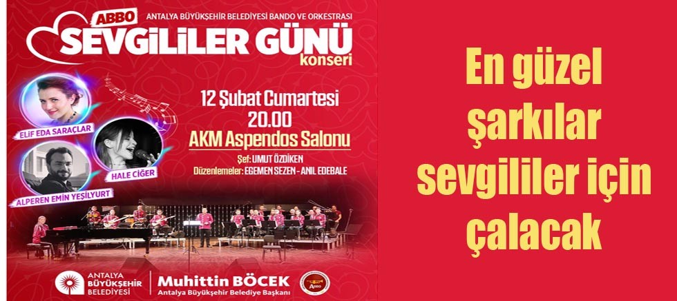Atatürk Kültür Merkezi Aspendos Salonu’nda ücretsiz olarak düzenlenecek konserde Elif Eda Saraçlar, Hale Ciğer ve Alperen Emin Yeşilyurt sahne alacak. Genç şarkıcılar, Antalya Büyükşehir Belediyesi Bando ve Orkestrası’nın çalacağı en güzel aşk şarkılarını seslendirecek. Düzenlemelerini Egemen Sezen ve Anıl Edebale’nin yaptığı şarkılar sevgililer için söylenecek.