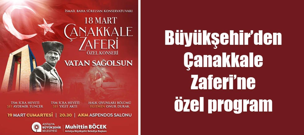 Çanakkale Zaferi’nin 107.yıldönümü nedeniyle, tüm şehitlerimizi bir kez daha anmak için Antalya Büyükşehir Belediyesi Kültür ve Sosyal İşler Dairesi Başkanlığı tarafından özel bir program hazırlandı. İsmail Baha Sürelsan Konservatuvarı Türk Sanat Müziği ve Türk Halk Müziği İcra Heyetleri’nin birlikte sahneleyecekleri “Vatan Sağ Olsun” Çanakkale Zaferi Özel Konseri 19 Mart 2022 Cumartesi günü Saat 20:30’da Atatürk Kültür Merkezi (AKM) Aspendos Salonu’nda gerçekleştirilecek. Özel bir repertuvar sunacak olan TSM İcra Heyeti, Şef Aydemir Tuncer yönetiminde; THM İcra Heyeti ise Şef Yiğit Aktı yönetiminde izleyicilerin karşısına çıkacak.