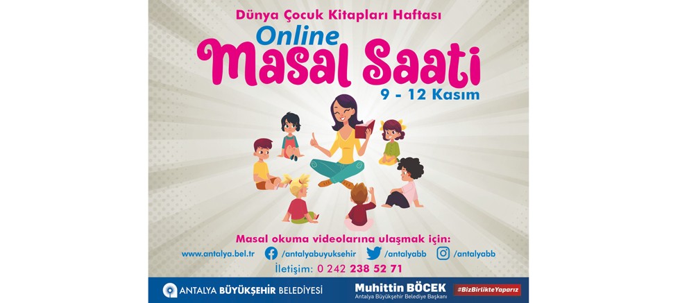 Antalya Büyükşehir Belediyesi her yıl Kasım ayının ikinci haftası kutlanan Dünya Çocuk Kitapları Haftası nedeniyle ‘Online Masal Saati’ etkinliği düzenliyor. 9-12 Kasım tarihleri arasında düzenlenecek Online Masal Saati etkinliğinde çocuklar en sevdiği masalları çevrimiçi dinleyecek.