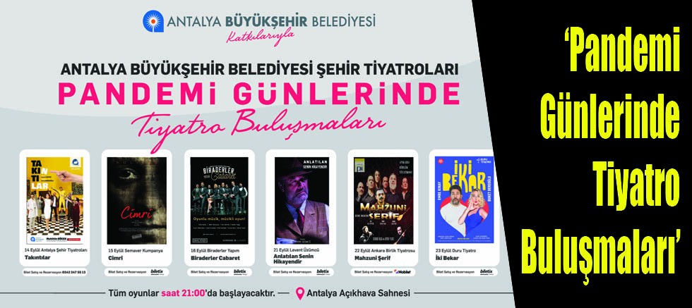 ‘Pandemi Günlerinde Tiyatro Buluşmaları’ kapsamında 14 -23 Eylül tarihleri arasında Antalya Açıkhava Sahnesi’nde altı farklı oyun tiyatro severlerle buluşacak. 14 Eylül’de AŞT’nin ‘Takıntılar’ isimli oyunla başlayacak etkinlik kapsamında 15 Eylül’de Semaver Kumpanya’nın ‘Cimri’, 16 Eylül’de Biraderler Yapım’ın ‘Biraderler Cabaret’, 21 Eylül’de Levent Üzümcü’nün ‘Anlatılan Senin Hikayendir’, 22 Eylül’de Ankara Birlik Tiyatrosu’nun ‘Mahzuni Şerif’ ve 23 Eylül’de Duru Tiyatrosu’nun ‘İki Bekar’ isimli tiyatro oyunu sahnelenecek.
