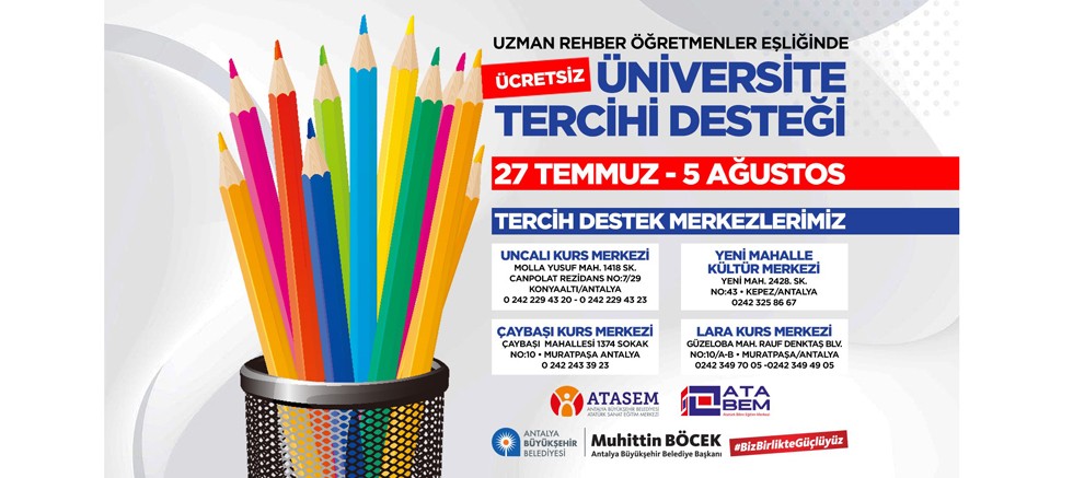Antalya Büyükşehir Belediyesi tarafından kurulan 4 farklı destek merkeziyle uzman rehber öğretmenler eşliğinde ücretsiz üniversite tercih desteği verilecek. Üniversite adayı gençlere 27 Temmuz Çarşamba gününden itibaren Konyaaltı Uncalı Kurs Merkezi, Kepez Yenimahalle Kültür Merkezi, Muratpaşa Çaybaşı Kurs Merkezi ve Muratpaşa Lara Kurs Merkezi’nde destek hizmeti sunulacak. Uzman rehber öğretmenler tarafından tercih danışmanlık hizmeti verilerek, öğrencilerin geleceklerini belirlemelerinde yardımcı olunacak. Üniversite adaylarına aldıkları puana göre en sağlıklı ve doğru tercih listelerini oluşturmalarında yardımcı olunacak.
