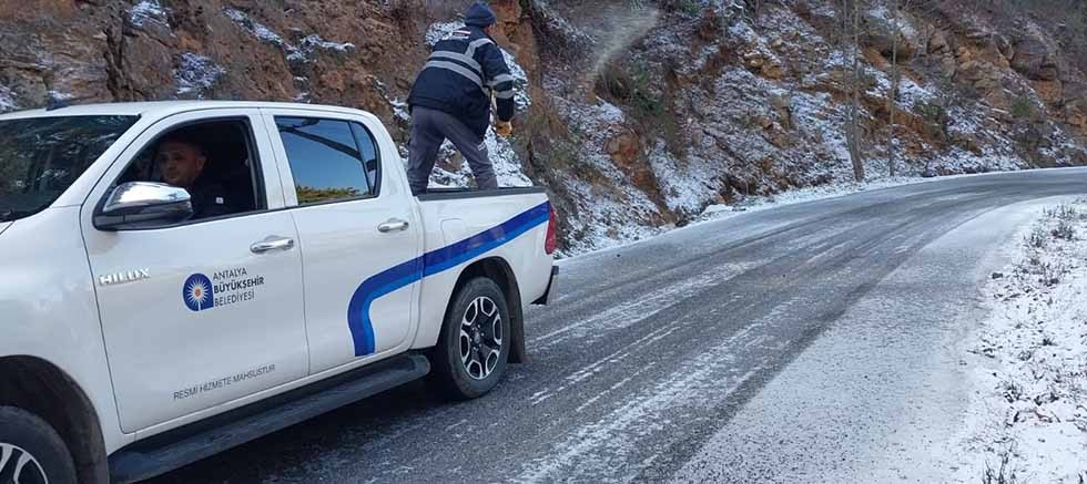Antalya Büyükşehir Belediyesi, Alanya’nın kırsal yollarının trafiğe açık kalması yoğun çaba gösteriyor. Büyükşehir ekipleri, yüksek kesimlerde tuzlama çalışması başlattı.