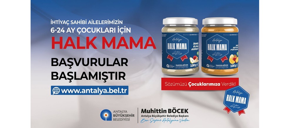 Antalya Büyükşehir Belediyesi, ihtiyaç sahibi ve çocuk besinlerine erişmekte zorluk çeken ailelere destek olmak amacıyla ‘Halk Mama’ projesini hayata geçiriyor. Proje kapsamında 6-24 aylık çocuklara her ay mama desteği sağlanacak.