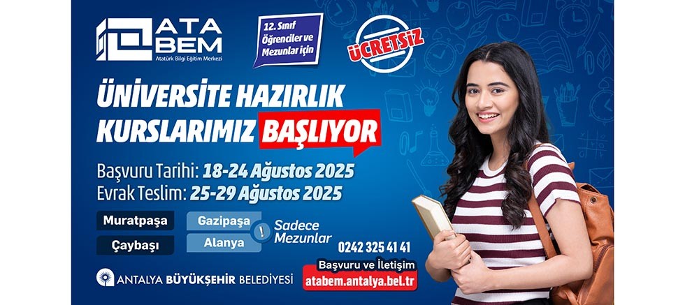 Antalya Büyükşehir Belediyesi Atatürk Kültür ve Bilgi Eğitim Merkezi (ATABEM) 12’nci sınıf öğrencileri ve lise mezunları için üniversite sınavına (YKS) yönelik hazırlık kursu açıyor. Ücretsiz kurslara online başvurular başladı.