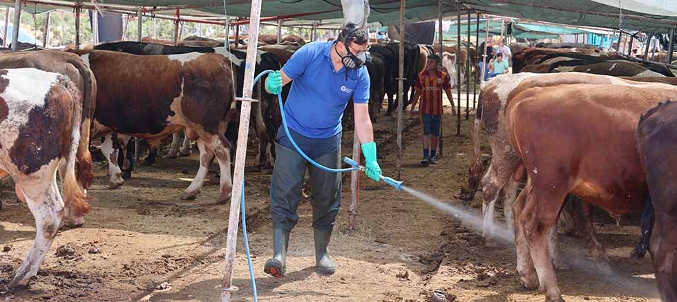 Antalya Büyükşehir Belediyesi Çevre Koruma ve Kontrol Dairesi Başkanlığı'na bağlı ekipler, yaklaşan Kurban Bayramı öncesinde kurbanlık hayvan satış noktalarında sivrisinek, karasinek ve kene gibi haşerelere karşı önlemler alıyor. 19 ilçede belirlenen kurbanlık satış noktalarında, ilçe belediyeleriyle koordineli bir şekilde ilaçlama çalışmaları periyodik olarak sürdürülüyor. İnsan ve hayvan sağlığının korunması amacıyla düzenli olarak sürdürülen çalışmalarla, başta karasinek ve vektör özelliği taşıyan haşerelerin üremesi engelleniyor.