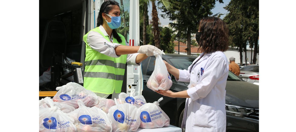 Büyükşehir Belediye Başkanı Muhittin Böcek’in talimatıyla Elmalı'da çiftçilerin elinde kalan elmalar Büyükşehir Belediyesi tarafından ederinden satın alınarak, halka dağıtılıyor. Büyükşehir Belediyesi Covid-19 salgınında büyük bir özveriyle çalışmaya devam eden sağlık çalışanlarını da unutmadı. Antalya ve ilçelerinde sağlık çalışanlarına Büyükşehir Belediyesi tarafından elma dağıtıldı. Üçer kiloluk ambalajlara konulan elmalar, sağlık çalışanlarına ulaştırılmak üzere hastane yönetimlerine teslim edildi.