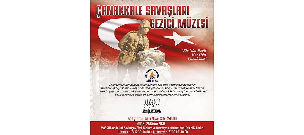 Muratpaşa Belediyesi, Çanakkale Zaferi’nin aziz hatırasını yaşatmak ve o destansı mücadeleyi gelecek nesillere aktarmak amacıyla hazırlanan Çanakkale Savaşları Gezici Müzesi’nin kapılarını Abdullah Sevimçok Sivil Toplum ve İnovasyon Merkezi’nde (ASSİM) açıyor.