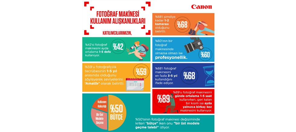 Her 10 katılımcıdan 1’i ise profesyonel fotoğrafçı olarak belirlendi. Katılımcıların yüzde 42’si fotoğrafçılığı hobi ve ilgi alanı olarak belirtip makinesini ayda ortalama 1 ila 5 defa arasında kullandığını paylaştı, yani Türkiye’de fotoğrafçıların neredeyse yarısı yaklaşık her hafta fotoğraf makinesini kullanıyor. Ankete katılanların yüzde 89’u kadar büyük oranı ise fotoğraf makinesini her kullanımda aralıksız 5 saate kadar kullandığını ifade ediyor.