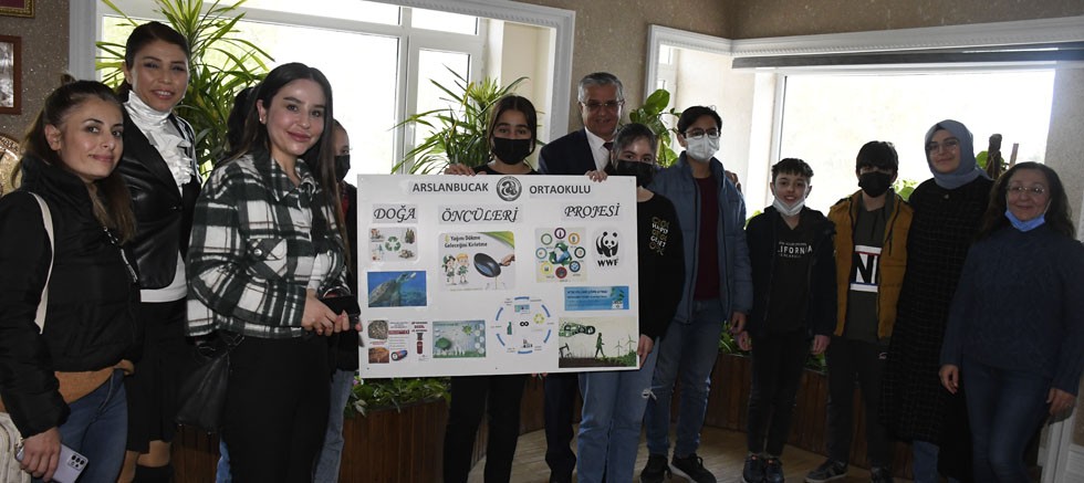 Arslanbucak Ortaokulundaki çevreci öğrenciler, Kemer Belediye Başkanı Necati Topaloğlu’nu ziyaret etti.