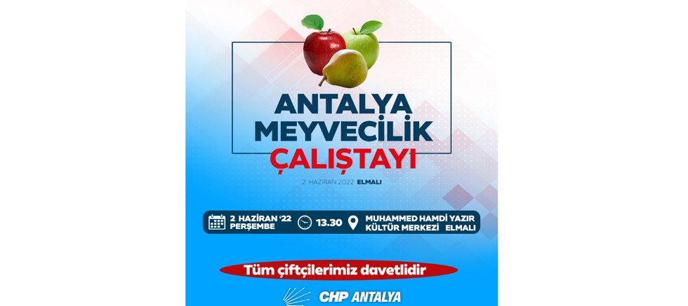 Cumhuriyet Halk Partisi Antalya İl Başkanlığınca düzenlenecek olan özellikle Elmalı ve Korkuteli ilçelerinde yetiştirilen Elma ve Armut üretimi, sorunları çözüm önerileri, pazarlanması ve meyve üretiminin dünü bugünü ve geleceğinin masaya yatırılacağı Meyvecilik Çalıştayı 2 Haziran 2022 Perşembe günü saat 13.30'da Elmalı’da Elmalılı Muhammed Hamdi Yazır Kültür Merkezi’nde gerçekleştirilecek.
