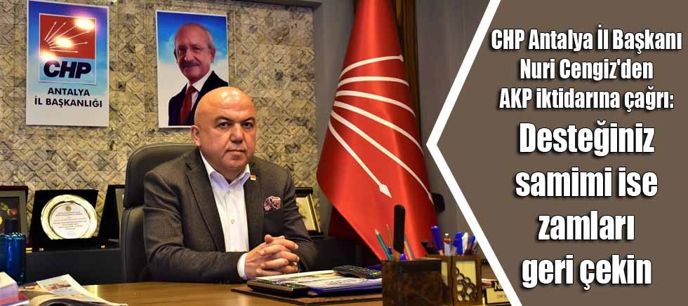 Aile Bakanı Derya Yanık’ın ‘ısınma desteği’ açıklamasının ardından Cumhurbaşkanı Erdoğan’ın da elektrik faturalarında düzenlenmeye gidildiğini duyurması yeni tepkilere yol açtı. Konuyla alakalı açıklama yapan CHP Antalya İl Başkanı Nuri Cengiz, AKP iktidarına “Desteğiniz samimi ise yaptığınız fahiş zamları geri çekin” çağrısında bulundu.