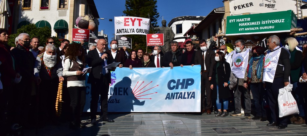 Cumhuriyet Halk Partisi, 22 yıldır anayasal emeklilik haklarının verilmesi için mücadele eden Emeklilikte Yaşa Takılanlar’ın sesi olmak amacıyla 81 ilde eş zamanlı olarak basın açıklaması düzenledi. Attalos Meydanı’nda CHP Emek Büroları, EYT Antalya Grubu, Tüm-Emekli Sendikası ve diğer sivil toplum kuruluşları temsilcileri ile birlikte CHP Antalya Milletvekilleri Aydın Özer, Çetin Osman Budak, Rafet Zeybek’in katılım sağladığı basın açıklamasını kamuoyu ile paylaşan CHP Antalya İl Başkanı Nuri Cengiz, “Emeklilikte Yaşa Takılanlar lütuf değil kazanılmış haklarını istiyor” dedi. Başkan Nuri Cengiz’in açıklamasının tamamında şu ifadeler yer aldı;