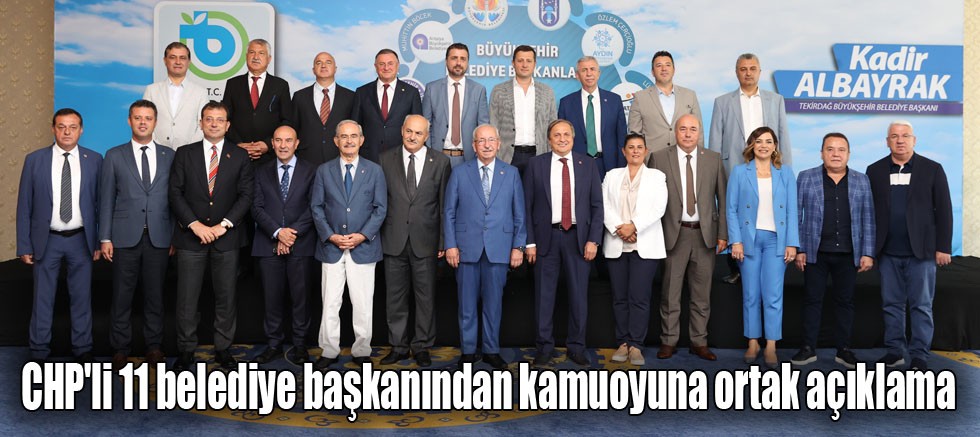 CHP’li büyükşehir belediye başkanları geleneksel hale gelen ‘Büyükşehir Belediye Başkanları Buluşması’nın 11’incisinde, Tekirdağ'da bir araya geldi. Tekirdağ Büyükşehir Belediye Başkanı Kadir Albayrak ev sahipliğinde gerçekleşen toplantıya, Antalya Büyükşehir Belediye Başkanı Muhittin Böcek, Adana Büyükşehir Belediye Başkanı Zeydan Karalar, Ankara Büyükşehir Belediye Başkanı Mansur Yavaş, Aydın Büyükşehir Belediye Başkanı Özlem Çerçioğlu, Hatay Büyükşehir Belediye Başkanı Lütfü Savaş, İstanbul Büyükşehir Belediye Başkanı Ekrem İmamoğlu, İzmir Büyükşehir Belediye Başkanı Tunç Soyer, Mersin Büyükşehir Belediye Başkanı Vahap Seçer, Muğla Büyükşehir Belediye Başkanı Osman Gürün ve Eskişehir Büyükşehir Belediye Başkanı Yılmaz Büyükerşen katıldı. Belediye Başkanları geleneksel hale gelen buluşmalarında gündemi değerlendirmek üzere toplantı gerçekleştirdi. Toplantının ardından başkanlar ortak bir basın açıklaması yayımladı. Açıklamada belediyelerin yaşadığı maddi zorluklara dikkat çekilirken iktidara, sağlık çalışanlarının özlük haklarını düzenleme çağrısında bulunuldu.