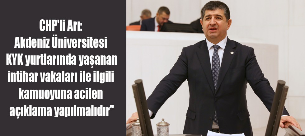 Antalya Milletvekili Cavit Arı, “Akdeniz Üniversitesi kampüsündeki Bezm-i Alem Valide Sultan Kredi Yurtlar Kurumu (KYK) Yurdu’nda kalan Halil Gülçan’ın 11 Mayıs’ta ardından aynı kampüs içindeki Elmalılı Hamdi Yazır Öğrenci Yurdu’nda kalan Muhammet Emre Kandemir’in 23 Mayıs’ta intihar haberi gelmiştir. En son 10 Haziran’da ise Turizm Rehberliği ikinci sınıf öğrencisi Muhammed Kaya’nın hayatını kaybettiği, hatta kamuoyundan saklanan dördüncü bir intihar vakasının olduğu söylenmektedir. Aynı yurtlarda yine kamuoyundan saklanan ve resmi verilere geçmemiş on intihar vakasının daha yaşandığı iddia edilmektedir. Öğrenci ve velilerin haklı endişe ve korkularının giderilmesine yönelik resmi makamlar tarafından kamuoyuna acilen detaylı bir açıklama yapılması gerekmektedir.” dedi.