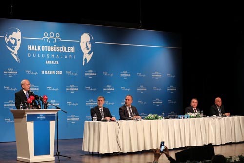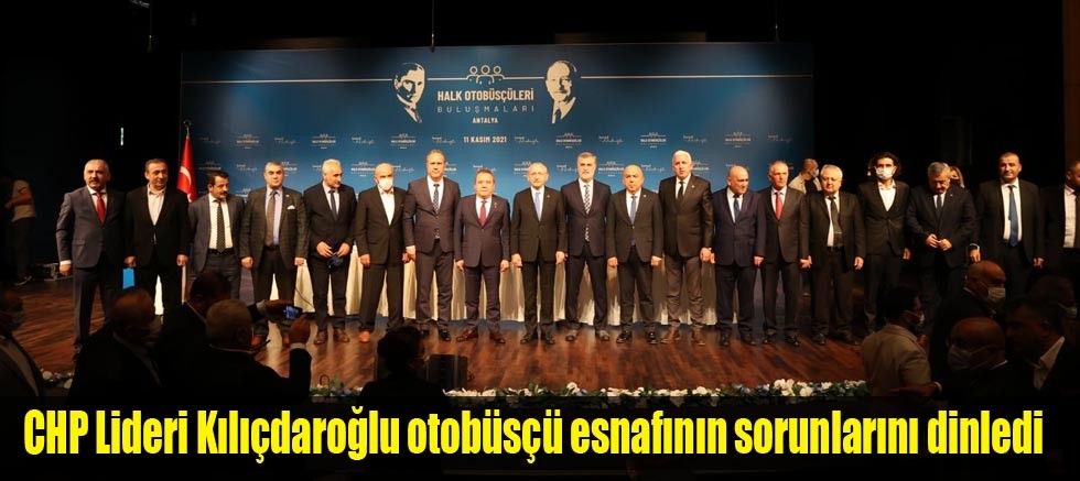 Cumhuriyet Halk Partisi Genel Başkanı Kemal Kılıçdaroğlu, Antalya Büyükşehir Belediye Başkanı Muhittin Böcek ile birlikte Atatürk Kültür Merkezi’nde düzenlenen Antalya Halk Otobüsçüleri Buluşması’nda halk otobüsçüsü esnafının sorunlarını dinledi. Toplantıda, Antalya Otobüsçüler Esnaf ve Odası Başkanı Yasin Aslan, İstanbul Özel Halk Otobüsleri Oda Başkanı Göksel Ovacık, Tüm Özel Halk Otobüsleri Birliği Başkanı Ercan Soydaş, Türkiye Özel Halk Otobüsleri Birliği (TOHOB) Ulaşım Danışmanı Öğretim Üyesi Dr. Taylan Engin, sorun, talep ve önerilerini dile getirdi.