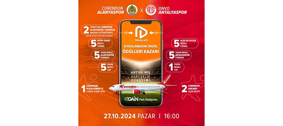 Maç sırasında Augmented Reality (AR), Virtual Reality (VR), Mixed Reality (MR) ve Artificial Intelligence (AI) gibi ileri teknolojileri bir araya getirerek taraftarlara akıllı telefonlar üzerinden benzersiz deneyimler sunan DevelAd platformu ile Corendon Airlines, sporun geleceğini şekillendirecek. DevelAd uygulamasını indiren Corendon Alanyaspor ve Onvo Antalyaspor taraftarları dijital oyunlar ve yarışmalarla takımına özel imzalı top ve forma, uçak bileti hediyesi, Corendon Playa Kemer'de tatil hediyesi gibi değerli hediyeler kazanacak.