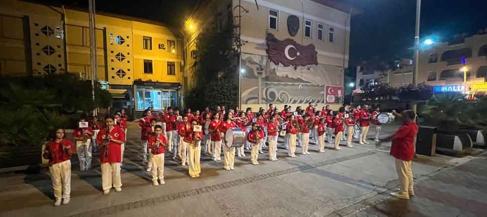 Kemer Belediyesi önünde toplanan Cumhuriyet Bandosu, hazırlık çalışmaları kapsamında Şef Furkan Üstündağ yönetiminde vatandaşlara ve turistlere seslendirdiği eserlerle güzel bir akşam yaşattı.