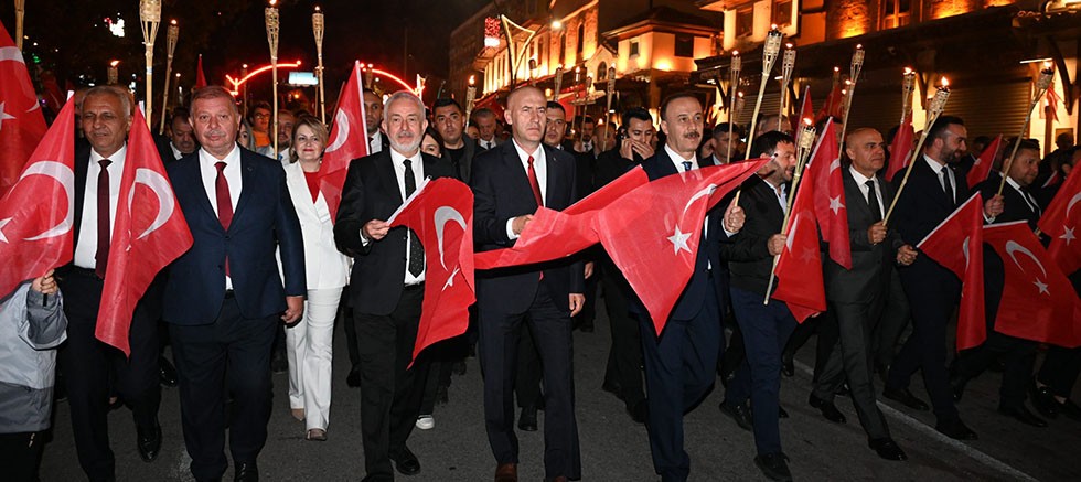 Fener Alayı ve Bayrak Yürüyüşünde protokol üyeleri ve vatandaşlar ellerinde Türk Bayrakları ve meşalelerle Mimar Sinan Caddesi üzerinden 15 Temmuz Cumhuriyet ve Demokrasi Meydanına kadar yürüdü. Yürüyüşte dev Türk Bayrağı ve Atatürk posteri de meydana kadar getirildi. Meydanda, saygı duruşu ve İstiklal Marşının okunmasının ardından bando ve mehteran gösterisi düzenlendi. Ertuğrul Kiraz da meydanda bulunan vatandaşlarla birlikte söylediği zafer şarkılarıyla bayram coşkusunu doyasıya yaşattı.