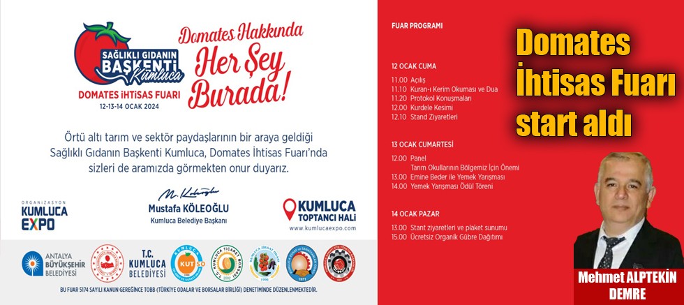 Kumluca İlçesi'nde, 12-13-14 Ocak tarihlerinde, "Kumluca Expo Sağlıklı Gıdanın Başkenti Kumluca Domates İhtisas Fuarı" düzenlenecek.