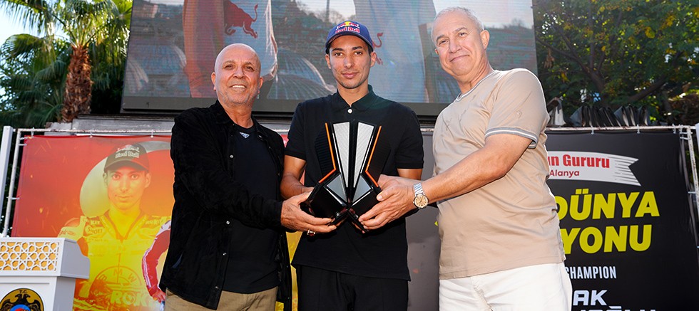 Razgatlıoğlu yaptığı konuşmasında tüm katılımcılara teşekkür ederek, “Dünya Şampiyonu olduğumuzda her zaman biz diyorum. Çünkü hep beraber bu şampiyonluğu elde ettik. Sizlerin sevgisi bizi çok güçlendiriyor. Beni bugün de yalnız bırakmadınız sizlere çok teşekkür ediyorum. Alanya’dan ya da Alanya dışından geldiniz her birinizin ayağına sağlık. Bu sene çok başka bir karşılama oldu. Sevginizi bu şekilde görmek bizi çok mutlu etti. İnşallah seneye de şampiyon olacağız. Biliyorsunuz son yıl zorlu geçti, son yarışta rakibimiz tarafından yarış dışı kaldık ama başardık. Bir şekilde o stres altında şampiyonluğumuzu ilan ettik. Şu anki yarıştığım yerde son senemdi artık MotoGP’de yarışıyorum. Orada yarışan ilk Türk olacağım. Biz her zaman ki gibi ülkemizi en iyi şekilde orada da temsil etmeye devam edeceğiz. Bayrağımızı orada da dalgalandırmaya devam edeceğiz. Yarış kazandıktan sonra her defasında bayrağımızla tur atıyoruz, bu inanılmaz bir duygu anlatılacak bir şey değil. Bu yıl 21 defa yarış kazandık. Bu, 21 defa İstiklal Marşı demek. Daha zorlu bir yere gidiyoruz. İki tekerde çıkabileceğimiz en üst yere gidiyoruz. MotoGP pilotu olmak önemli değil orada iz bırakmak bizim için önemli. Orada da başarılı olursak, hayalimizin de ötesine geçmiş olacağız.” dedi. Razgatlıoğlu, konuşmasının ardından Belediye Başkanı Özçelik ve Alanyaspor Başkanı Çavuşoğlu, 2025 Dünya Superbike Şampiyonluk Kupasıyla poz verdi.