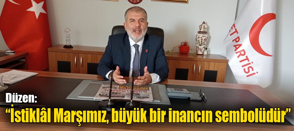Düzen, mesajında şunları kaydetti: “Ezanımıza, bayrağımıza, bağrında değerlerimiz yolunda nice hatıralar taşıyan aziz vatanımıza karşı görevlerimizi hakkıyla yerine getirmek ve bu değerleri koruyacak ve yaşatacak bir bilince sahip olmak her birimiz için tarihe, bugüne ve istikbale dair en büyük sorumluluktur. Bu duygu ve düşüncelerle; İstiklâl Marşımızın TBMM tarafından kabulünün yıldönümünde, vatan şairimiz Mehmet Akif Ersoy, başta olmak üzere tüm şehitlerimizi ve kahraman gazilerimizi rahmet ve minnetle anıyorum. Cenâb-ı Hak’tan milletimizi ve memleketimizi her türlü tehlike ve kötülüklerden muhafaza buyurmasını ve ilelebet payidar kılmasını niyaz ediyorum” dedi.