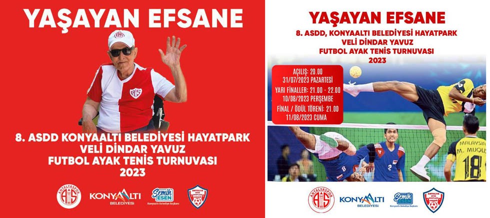 Antalya Spor Dostları Derneği tarafından her yıl düzenlenen ayak tenisi turnuvası, geçtiğimiz yıl olduğu gibi bu yıl da Konyaaltı Belediyesi'nin ev sahipliğinde düzenlenecek. Antalyaspor tarihinde efsaneleşmiş kişiler adına düzenlenen turnuva, bu yıl yaşayan efsane Veli Dindar Yavuz (Donsuz Veli) adına yapılacak. Konyaaltı Belediyesi’nin desteği ve ev sahipliği ile düzenlenecek olan turnuva Hayatpark’ta gerçekleştirilecek. 11 gün sürecek turnuva 31 Temmuz Pazartesi günü başlayıp, 11 Ağustos Cuma günü oynanacak final maçının ardından ödül töreni ile son bulacak.