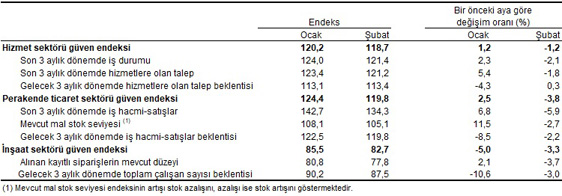 Reel kesim güven endeksi bir önceki aya göre Ağustos ayında %0,1 oranında artarak 112,2 değerini, hizmet sektörü güven endeksi %1,2 oranında artarak 116,1 değerini, perakende ticaret sektörü güven endeksi %0,6 oranında artarak 110,3 değerini, inşaat sektörü güven endeksi %7,1 oranında artarak 92,4 değerini aldı. Tüketici güven endeksi %1,6 oranında azalarak 78,2 değerini aldı.