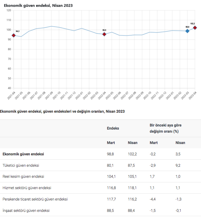 Türkiye İstatistik Kurumu (TÜİK), Nisan 2023 dönemine ilişkin ekonomik güven endeksi verilerini açıkladı. Ülkemizde ekonomik güven endeksi 102,2 oldu.