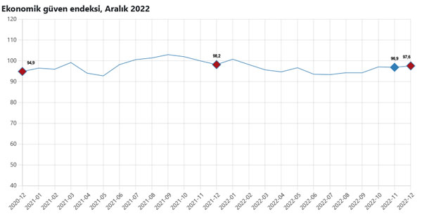 Türkiye İstatistik Kurumu (TÜİK), Aralık 2022'ye ilişkin ekonomik güven endeksi verilerini açıkladı. Ülkemizde ekonomik güven endeksi 97,6 oldu.