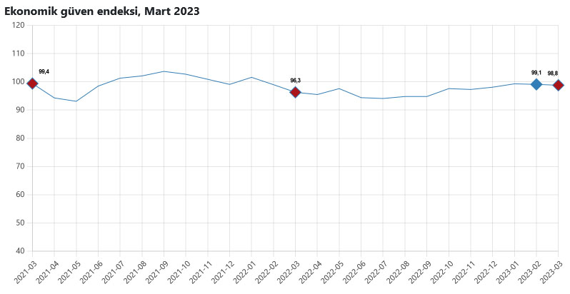 Ekonomik güven endeksi Şubat ayında 99,1 iken, Mart ayında %0,2 oranında azalarak 98,8 değerini aldı.