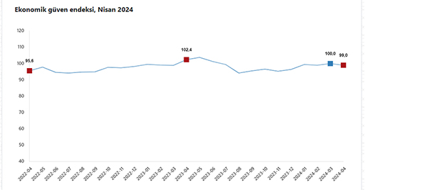 Ekonomik güven endeksi Mart ayında 100,0 iken, Nisan ayında %1,0 oranında azalarak 99,0 değerini aldı.
