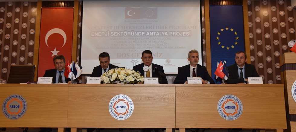 Antalya Esnaf ve Sanatkârlar Odaları Birliği (AESOB) tarafından Voc-Test Merkezleri III Hibe Programı altında yürütülen TREESP2.3.TUYEP/P-03/28 sözleşme numaralı ve toplam bütçesi 230.049,90 Avro olan “Enerji Sektöründe Antalya” isimli proje kapsamında "MYK ULUSAL MESLEK STANDARTLARINA GÖRE 9 MESLEK İÇİN MEB HBÖGM MODÜLER PROGRAMLARI İÇİN TAVSİYE RAPORU" basın toplantısı Antalya Esnaf ve Sanatkârlar Odaları Birliği toplantı salonunda 1 Mart 2023 Çarşamba günü saat 15.00 de gerçekleştirildi.
