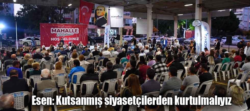 Altınkum’da mahalle buluşmasında konuşan Konyaaltı Belediye Başkanı Semih Esen, “Halkın gerçek sorunlarına kulak tıkayan, kendini herkesin üstünde gören kutsanmış siyasetçilerden bir an önce kurtulmalıyız” dedi.