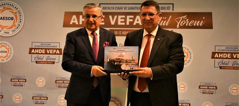 Antalya Esnaf ve Sanatkarlar Odaları Birliği (AESOB) tarafından Kemer Rox Royal Hotel’de düzenlenen törene, Belediye Başkanı Necati Topaloğlu’nun yanı sıra, Ticaret Bakanlığı Esnaf, Sanatkarlar ve Koopertatifçilik Genel Müdürü Necmettin Erkan, Antalya Ticaret İl Müdürü Halil Özşahan, AESOB Başkanı Adlıhan Dere ve davetliler katıldı.